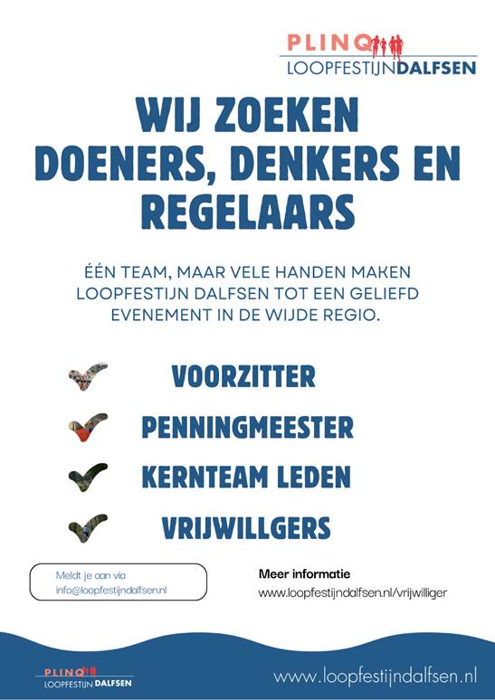 Voor PLINQ Loopfestijn Dalfsen zoeken we niet alleen vrijwilligers op de dag zelf, maar ook een aantal nieuwe leden voor de organisatie. Mensen die het leuk vinden om mee te denken, mee te bouwen en het evenement structureel verder te laten groeien.